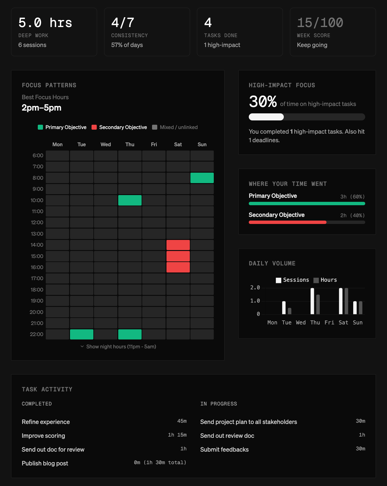 The underlying data and ideas are the same, but the layout is cleaner and more opinionated about what matters: when focus actually happens, how time is split across objectives, and what concrete work got done in a given week.